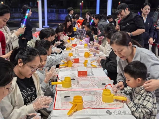 “自己做的月饼特别香甜!”月饼DIY区排起长龙,亲子家庭、情侣们围坐一桌,在师傅指导下揉面团、包馅料、压模具,体验传统美食制作的乐趣。不一会儿,一个个精美的月饼新鲜出炉,香气四溢。这份亲手制作的中秋心意,让参与者倍感温馨。