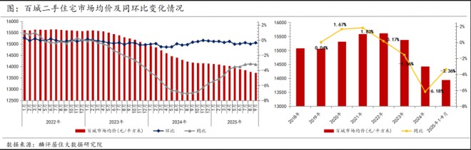 前三季度,100个重点城市房价为13943元/㎡,较2024年下跌3.36%,较2024年6.18%的跌幅收窄2.81个百分点。截至9月,百城二手房价格环比连续下降31个月,同比连续下降33个月。