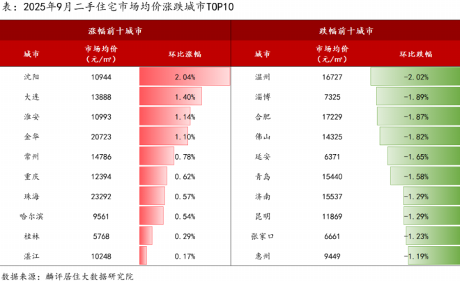 二线城市表现好于一线城市,其环比跌幅近3个月小于一线城市。其中,东北城市沈阳、大连、哈尔滨9月房价上升;泉州、宁波、杭州、厦门等东南沿海城市跌幅靠前,泉州年内房价降幅较大,同比跌幅多达14.31%。