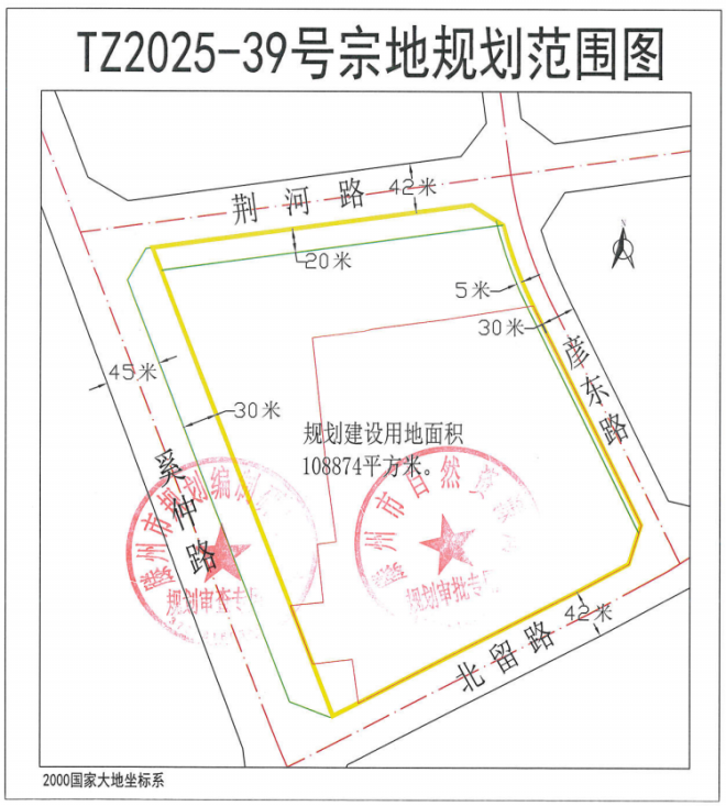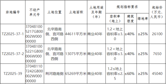TZ2025-39号宗地,位于荆河路南侧。土地面积65269平方米,土地用途及年期为商业40年。规划指标要求:1.2≤地上容积率≤2.5,建筑密度≤60%,绿地率≥25%。起始价45040万元。