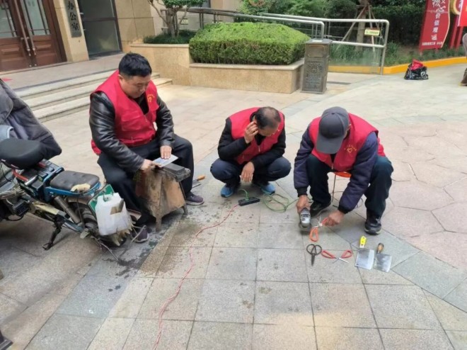 物业工作人员化身“磨刀匠”,将一把把略显钝涩的菜刀、剪刀在磨刀石上反复打磨,动作沉稳有力。