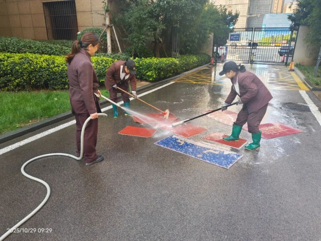 家门口的地垫易脏难洗、不易晾晒,物业工作人员便积极架起高压水枪,免费为业主们冲刷、清洗家中的地垫。