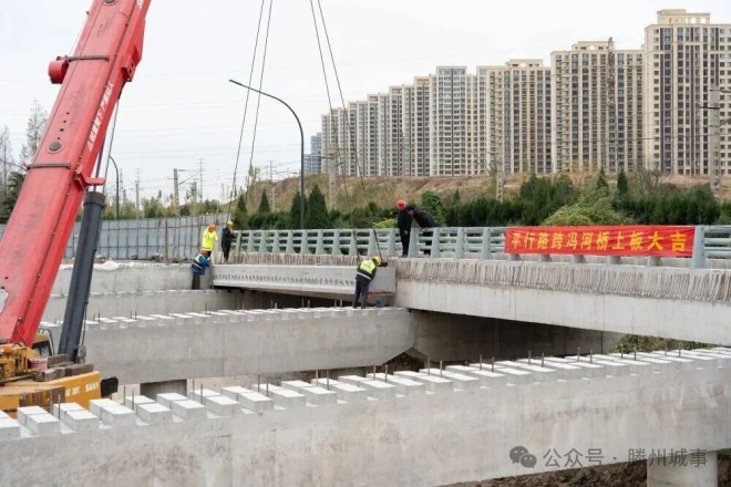 据悉,平行路跨冯河桥桥面全宽33米,东侧8米已建成通车,此次西侧吊装桥板的桥梁全长48米,宽25米。两幅桥全部建成后将统一进行交通标线及护栏设置,形成整体。此次桥板吊装为项目建成通车奠定了坚实基础,建成后,将极大缓解区域交通压力,方便居民出行。