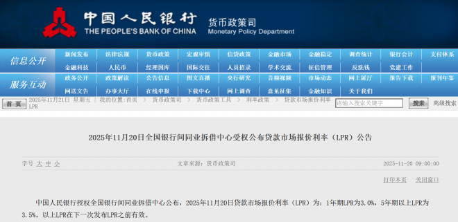 11月20日,中国人民银行授权全国银行间同业拆借中心公布的新一期贷款市场报价利率(LPR)显示,1年期LPR为3.0%,5年期以上LPR为3.5%。据悉,这是连续第六个月维持不变。