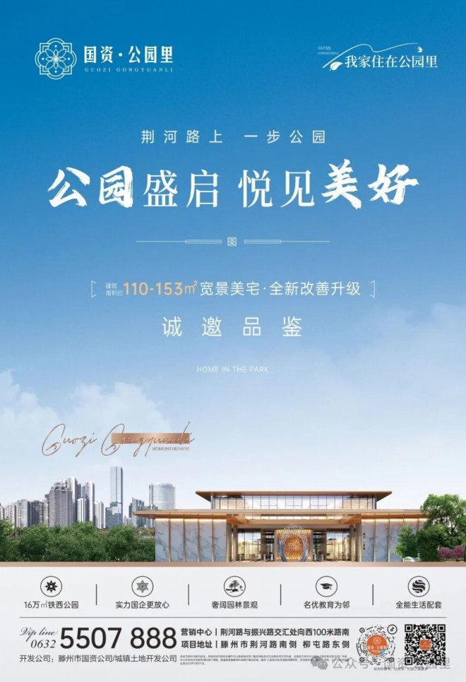 国资·公园里由滕州市国有资产经营有限公司旗下城镇土地开发公司开发,项目位于荆河西路南侧、柳屯路东侧,总规划约17万方,规划有11层洋房,16-23层小高层和高层,规划建面约110-153㎡宽景轻奢户型。