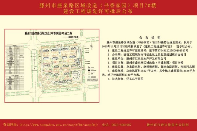 盛泉路区域改造(书香家园)项目7#楼建设工程规划许可批后公布