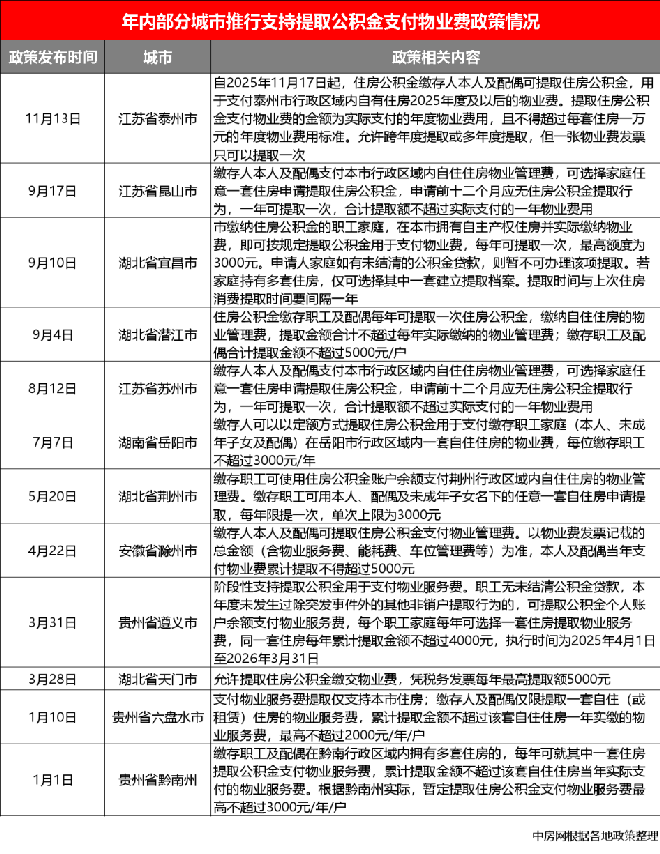 据中房网不完全统计,今年以来,至少已有湖北省宜昌市、潜江市、荆州市、天门市,江苏省泰州市、昆山市、苏州市,贵州省遵义市、六盘水市、黔南州,湖南省岳阳市、安徽省滁州市等12城推行了支持提取公积金支付物业费的相关政策。