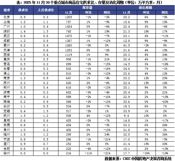 去化周期方面,因新房供应放量而成交持稳回落,因而30城11月整体供求比由上月的0.6增至0.82。
