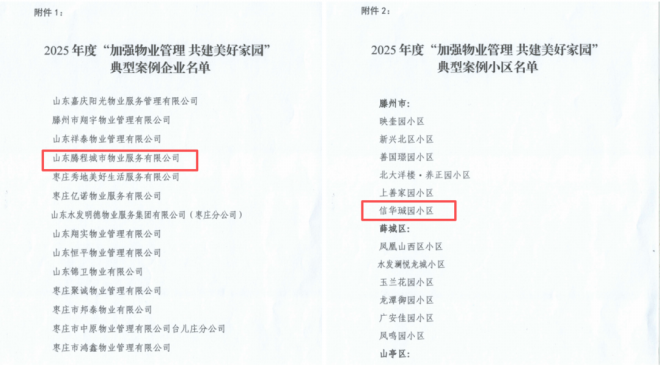 近日,枣庄市2025年度 “加强物业管理 共建美好家园” 典型案例名单正式公布,腾程物业公司及所服务的信华珹园分别成功入选典型案例企业及小区。