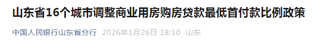 为贯彻落实党中央、国务院决策部署,适应房地产市场供求关系的新变化,支持构建房地产发展新模式,根据《中国人民银行 国家金融监督管理总局关于调整商业用房购房贷款最低首付款比例政策的通知》(银发〔2026〕14号)要求,中国人民银行山东省分行会同金融监督管理部门根据城市政府调控要求,按照因城施策原则,指导山东省市场利率定价自律机制对山东省16个城市的商业用房购房贷款最低首付款比例政策作出以下调整: