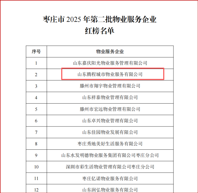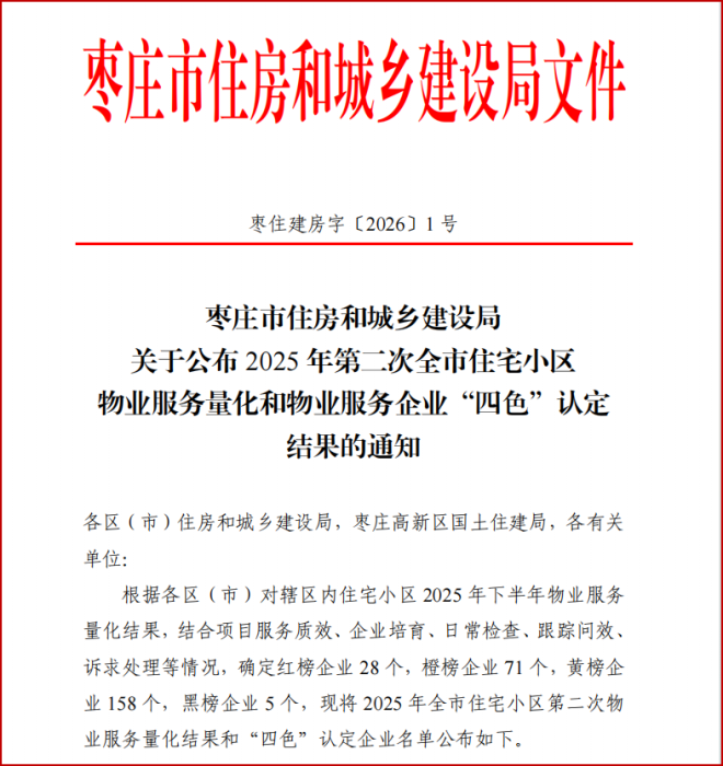 近日,枣庄市住房和城乡建设局公布了《2025年第二次全市住宅小区物业服务量化和物业服务企业“四色”认定结果》,信华集团腾程物业服务有限公司凭借卓越的服务品质与扎实的业务能力,荣登枣庄市物业服务企业红榜。这是公司自2021年来第六次获此殊荣。