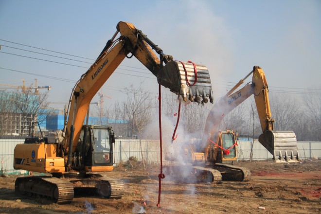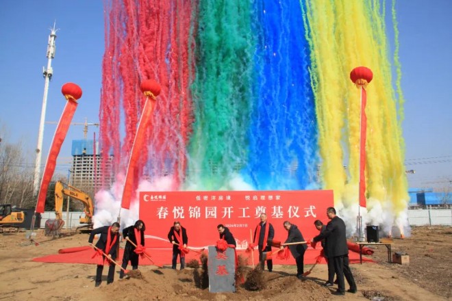 上午10时58分,奠基仪式开始。在现场嘉宾的共同见证下,各位领导与嘉宾移步奠基区,手持系有红绸的铁锹,共同为项目培土奠基。伴随着彩烟齐鸣、礼炮轰鸣、挖掘机鸣笛,春悦锦园奠基仪式圆满礼成,拉开了项目建设的序幕。