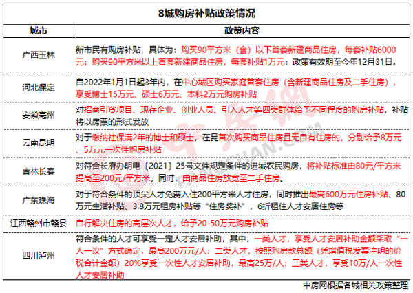 据中房网不完全统计,年初至今至少有8个城市出台或落实了购房补贴政策,具体城市包括昆明、长春、珠海、玉林、保定、亳州、赣县以及泸州。