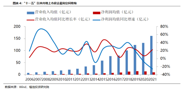 首先是利润下滑甚至亏损。2021年上市房企营收规模再创新高,但“增收不增利”。2021年前三季度内地上市房企营收规模均值达到161.3亿元,创新高,营收同比增长22%。但自2019年起,内地上市房企净利润增速持续回落,2021年前三季度利润同比下降26%,2021年降幅为“十一五”以来最大降幅。