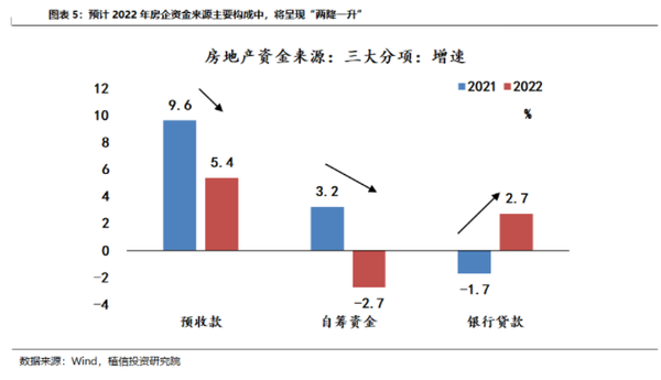 供给端将从金融、保障性住房、土地等方面提供政策支持,有利提振行业供给能力。一是银行将加大对房企贷款支持力度,2021年房企国内贷款为历史最低水平,预计2022年住房金融政策将推动金融机构适度扩大开发贷投放力度,全新增开发贷款约3000亿元,增速回升至3.5%左右。