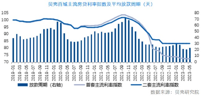贝壳研究院近日发布的报告显示,2023年5月百城首套主流房贷利率平均为4.0%,较上月微降1BP;二套主流房贷利率平均为4.91%,与上月持平。5月首二套主流房贷利率较去年同期分别回落91BP和41BP。
