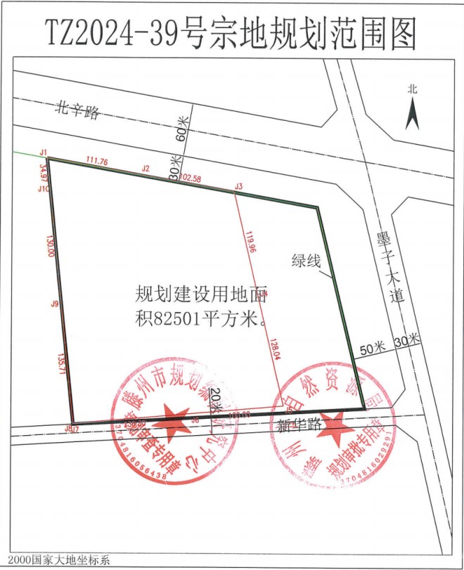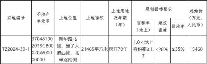 TZ2024-39-1号宗地,位于新华路北侧、墨子大道西侧、北辛路南侧,土地面积21465平方米,土地用途及年期为居住70年。