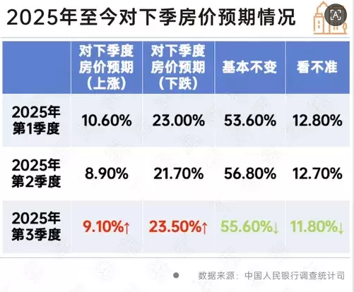 2025年第三季度,中国人民银行在全国50个城市进行了2万户城镇储户问卷调查,结果显示:对下季房价,9.1%的居民预期“上涨”,55.6%的居民预期“基本不变”,23.5%的居民预期“下降”,11.8%的居民“看不准”。