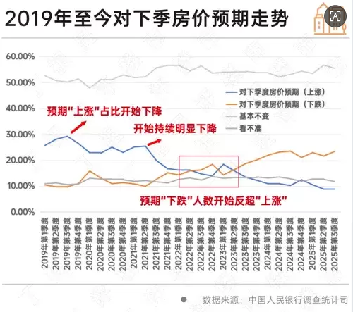从2019年第一季度至2025年第三季度对下季度房价预期的整体趋势来看,曾经出现过多个明显变化节点,这些节点与整体市场变化有所呼应。