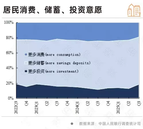 《城镇储户问卷调查报告》显示,2025年第三季度,倾向于“更多消费”的居民占19.2%,比上季低4.1个百分点;倾向于“更多储蓄”的居民占62.3%,比上季低1.5个百分点;而倾向于“更多投资”的居民占18.5%,比上季高5.6个百分点,且明显高于近两年水平。
