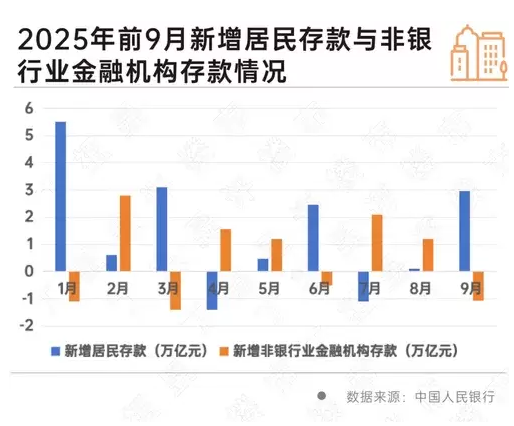 逐月来看,2025年以来已出现多个月新增居民存款和非银行业金融机构存款发生周期变化情况,如7月、8月居民存款连续两个月低于季节性增幅,同时非银金融机构存款相应增加。