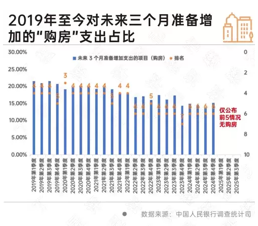 2025年至今,《城镇储户问卷调查报告》仅公布未来三个月准备增加的支出项目的前5位,“购房”连续3个季度不在其公布范围内。