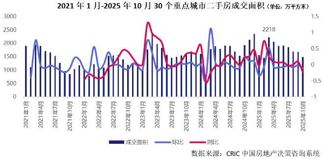 克而瑞数据显示,截至2025年10月,30个重点城市二手房成交面积为1469万平方米,环比下降12%。